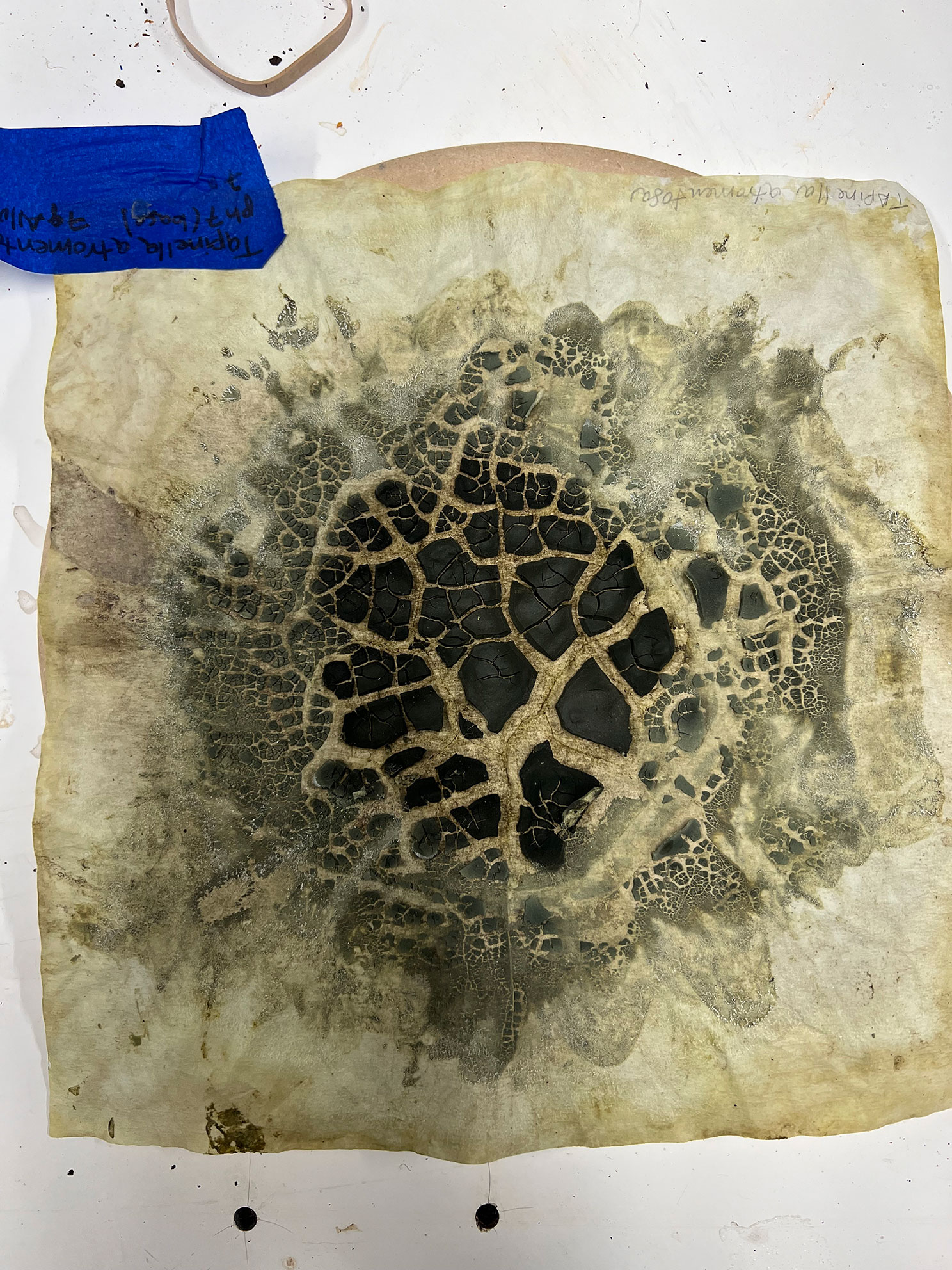 Las piezas enfrente de ti fueron creadas con color extraído de hongos silvestres que recolecté, procesé y transformé en pintura. El paisaje lo conforman edificios inspirados en la arquitectura de la Ciudad de México y también en la modernidad de Caracas. Sin embargo, aparecen todos envueltos en una membrana cutánea. En este sentido, la piel se convierte en una metáfora de las historias que habitan las ciudades en las que he vivido. La dermis representa memorias migrantes que colisionan en (des)conexiones y caos social. Todo lo contrario al mundo Fungi, que se encuentra interconectado en redes que buscan el bienestar común.