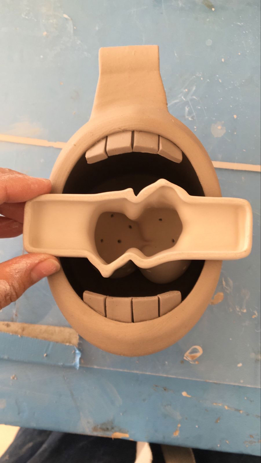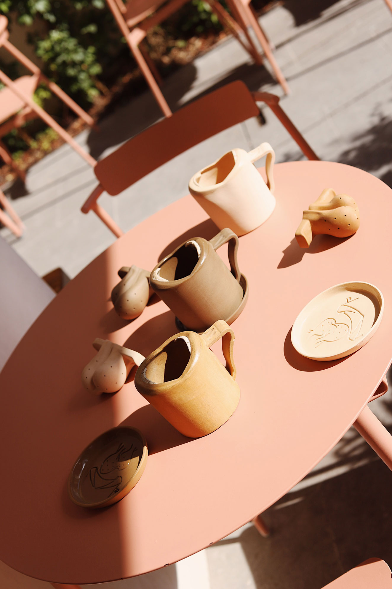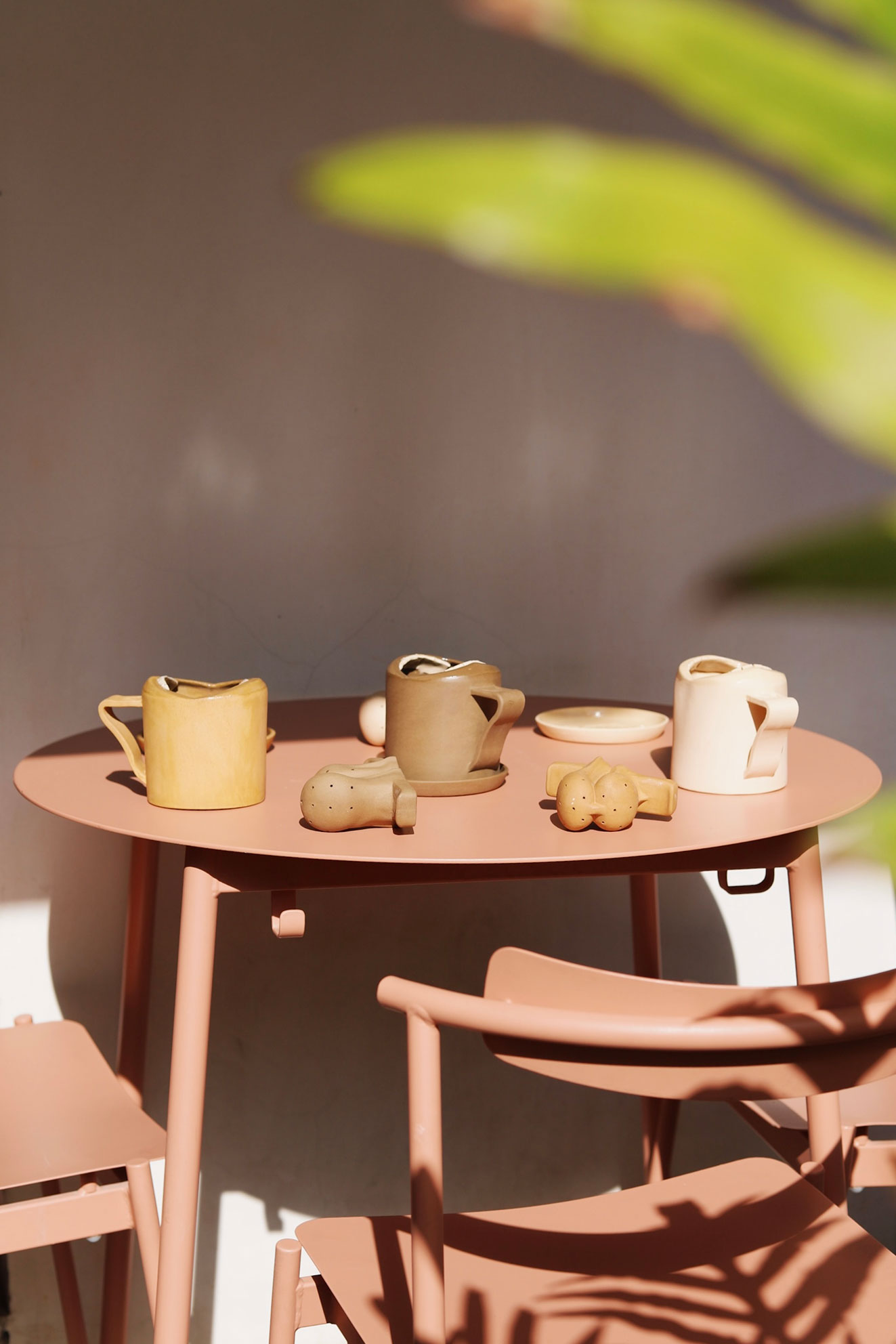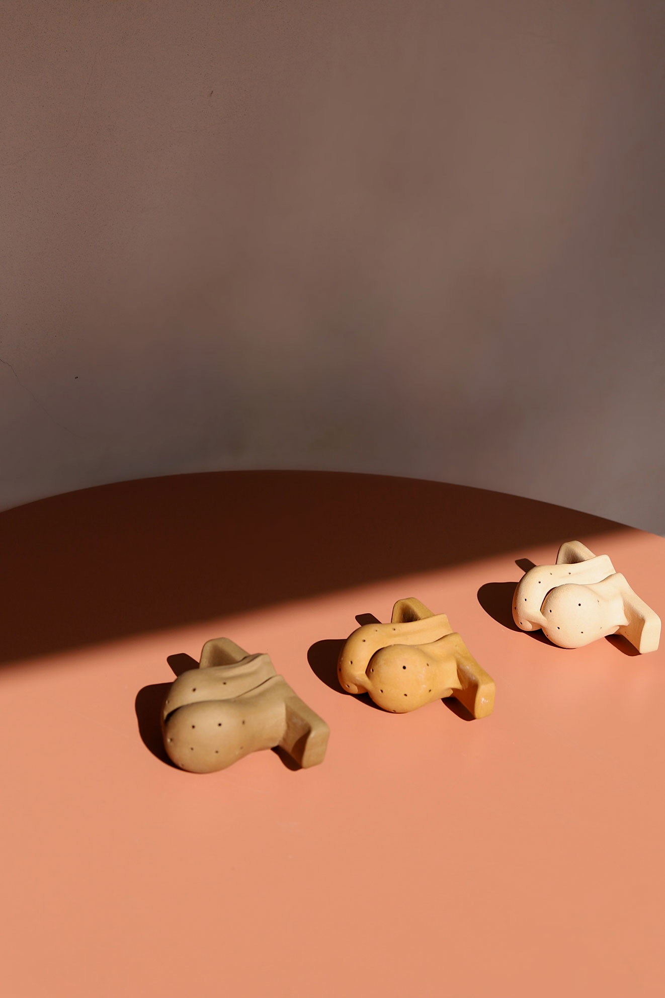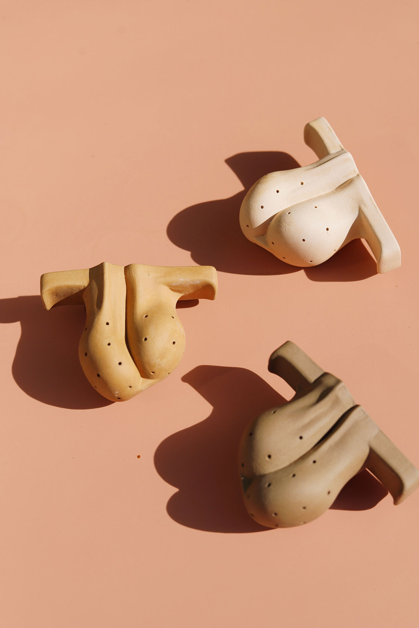 Empecé a experimentar con el barro inspirado en la tradición mexicana y en aprender de tantos profesionales de la alfarería que radican en la Ciudad. Mi investigación la lidera una curiosidad por representar la piel y en buscar elementos universales que pueden estar presentes en todos los cuerpos independientemente de sus simulacros de sí. Por ejemplo: los pezones y los anos. También, en convertir elementos cotidianos como un infusor de té en objetos psicosexuales.